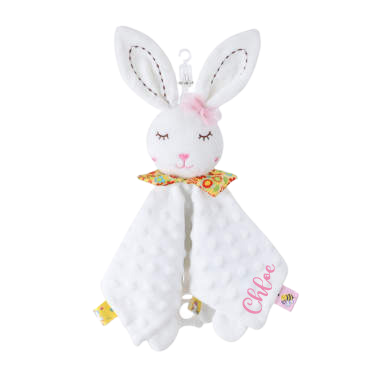 This lovely sensory toy is perfect for stimulating babies senses. It promotes cognitive development throught verious textures and sounds. It is also very soothing for babies. It comes in different colors ( white bunny, blue bunny and grey elephant) and it is personalised on the bottom hem. Add a name or short text of your choice.